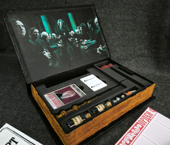 Сначала пришла идея про коробку. Мы видели ее не просто коробкой, в которой храниться компоненты игры, а это должна была быть книга-гримуар с темными заклинаниями. Первый вариант был обклеить книгу бежевой крафтовой бумагой, лоскутами с рванными краями, будто это настоящая кожа. Сразу поясню такой «кровавый» и жестокий вид: Темный Лорд был самым ужасным, кровавым, беспощадным и бездушным магом. Книга должна была стать его гримуаром и соответствовать его жестокости.