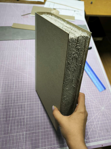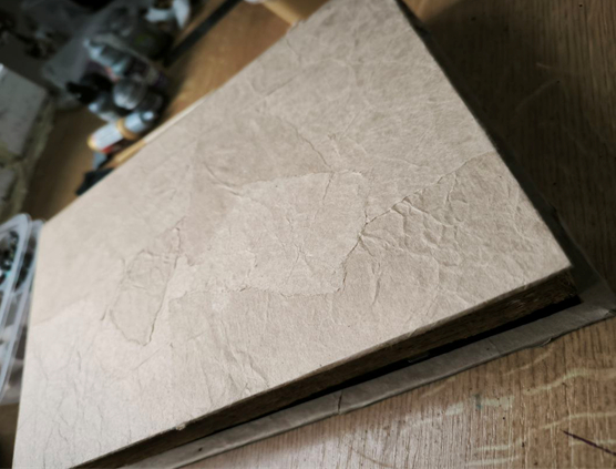 Далее, так как это книга, нужно было и придать ей вид книги, а где Вы видели книгу без страниц. Следующий этап, это сделать странички. 3 стороны решено было нанести мастихином шпатлевкой по дереву, потом «причесать» расческой и получаются полоски, будто бы странички. После того как шпатлевка полностью высохла, прошлись проливкой для создания теней. Получилось так будто это очень древняя книга, настолько что листы книги состарились и поизносились.