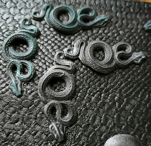 Идея нам сразу зашла. Нам очень понравилось. Не хотели даже ничем красить, решили оставить так. Но! Идей было много, решили попробовать кардинально противоположный вариант с эко кожей, но не абы какой. Решил, что змеиный принт будет 100 % попаданием, здесь отсылка и к Нагайне, и к парсылтангу, и к наследнику Слизерин. «Сделаем два варианта, и уж потом из двух вариантов выберем лучший», - сказали Они)).