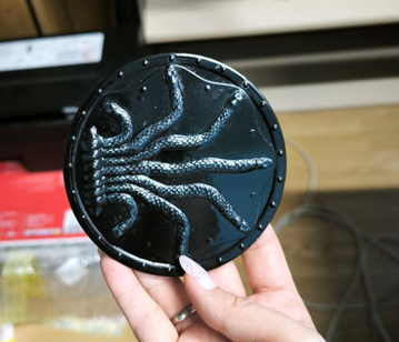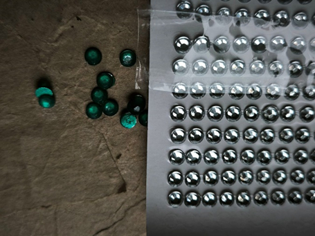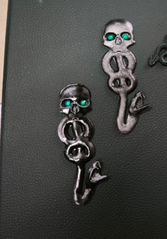 Все-таки остановились на метке пожирателей смерти. Теперь хотелось как-то покрасить, выделить эти штучки. Покрасили в черный цвет, в глазницы метки приклеили стразы. Стразы изначально были белые. Тоже смотрелось круто, но слишком ярко. Это все-таки пожиратели. Думала сначала заказать темно-изумрудные стразы. Не мола найти подходящий цвет. Вот когда в голове есть картинка, тяжелее подобрать некоторые компоненты. В итоге муж придумал гениальное решение. Соскоблил блестящий слой со страз, и покрасил краской нужного цвета. И получилось то, что нужно.