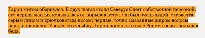 Что касается чёрного актёра на роли Снейпа — тут зачастую вопрос в уважении к произведению и зрителю. Вот первое описание персонажа в книге:
