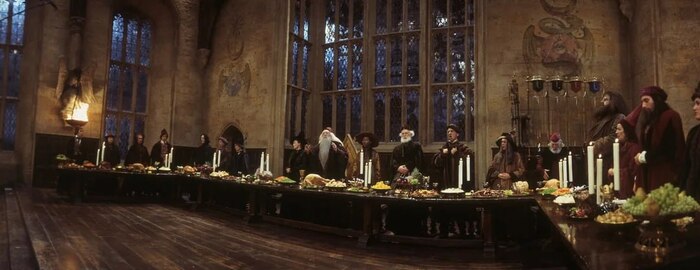 • Фред с Джорджем набрали еды в столовой, чтобы отпраздновать победу Гарри. Фред рассказал Гермионе, как проник в столовую: за картиной с фруктами есть потайная дверь, чтобы ее открыть, нужно пощекотать грушу, она хихикнет и превратится в дверную ручку.