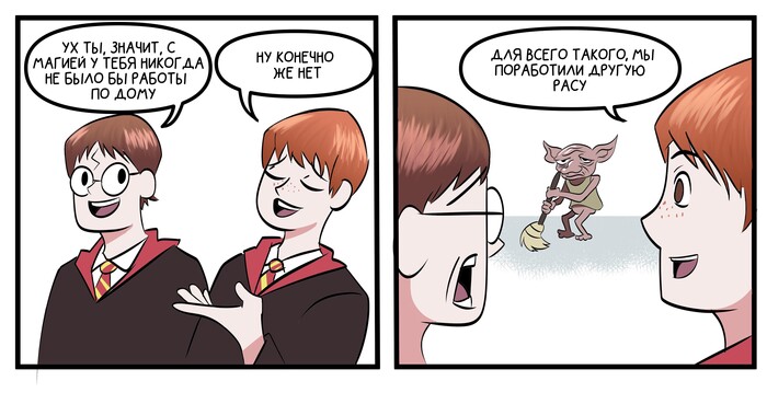 • Когда Гермионе удалось проникнуть в столовую, она привела туда и Рона с Гарри. Ребята увиделись с Добби и Винки, они работали там примерно неделю, были хорошо одеты. Добби хотел приобрести себе свитер, а Рон предложил ему свой, так как мама постоянно вяжет для него свитера. Добби рассказал, как долго скитался, так как его не хотели принимать на работу за зарплату, но он нашел Винки, и они обратились к Дамблдору. Директор принял их, предложил им платить 10 галеонов и 2 выходных, но Добби согласился на 1 галеон и 1 выходной, так как до сих пор не мог полностью привыкнуть к свободе и посчитал, что Дамболдор предложил слишком много. Винки и все остальные эльфы совсем не понимали Добби, им нравилось прислуживать. Винки рыдала и причитала, что Крауч не справится без нее, Гермиона рассказала ей, что Крауч недавно прибыл в Хогвартс вместе с Бэгменом и прекрасно себя чувствует без Винки. Винки выпалила, что Крауч рассказывал ей что-то очень плохое про Бэгмена, что он ему не нравится, но что именно она рассказать не могла, так как эльфы не выдают секреты семей, которым прислуживали. Гермиона была рада, что сейчас у эльфов есть Добби, который мало-помалу вобьет в их головы, что быть свободными — это не так уж и плохо.