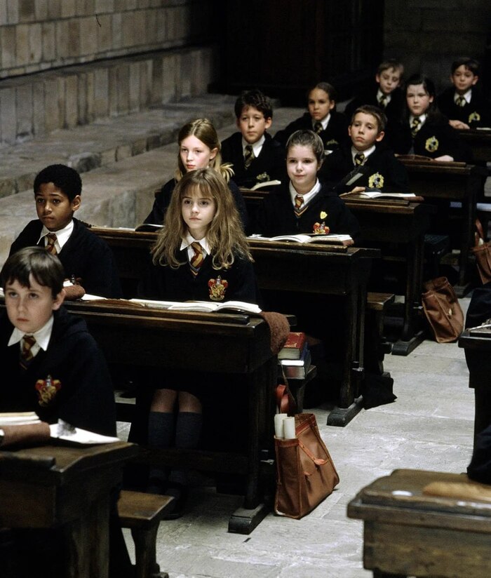 • Перед уроком Зельеварения слизеринцы издевались над Гарри посредством своих значков, на которых было написано «Гарри — смердяк». А затем Драко опять назвал Гермиону грязнокровкой. Гарри не выдержал, достал палочку, и они с Малфоем одновременно использовали заклинания: «Фурункулюс» — сглаз для появления на теле противника ужасных нарывов и «Дантисимус» — порча, вызывающая быстрый рост верхних резцов, после которого они становятся очень длинными. Причем заклинание Гарри отрикошетило в Гойла, а Драко — в Гермиону, отчего у Гермионы начали расти верхние резцы. Драко нажаловался Снеггу, тот отправил Гойла в больничное крыло, а Гермионе сказал, что не так уж она и изменилась, и влепил минус 50 очков Гриффиндору, а также решил оставить Рона и Гарри после уроков. Когда Гермиона прибежала к мадам Помфри, та ей сказала, чтобы она позвала ее, когда зубы уменьшатся до нужного размера. Гермиона позвала ее не сразу, а дождалась, когда зубы уменьшаться до того размера, который она сама посчитала нужным. После этого случая ее зубы стали намного меньше и ровнее, чем были раньше. Гарри с Роном не сразу заметили изменения, только когда Драко снова решил поиздеваться над ее зубами (в книге ее передние зубы были немного неровными).
