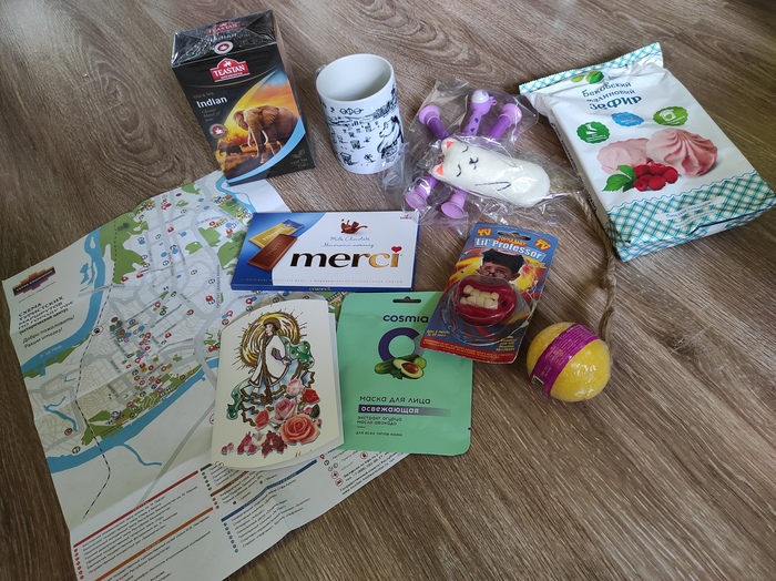 Гастрообмен - один из моих самых любимых на Пикабу. И вот настал момент писать отчёт, т.к. я получила посылку! Я написала в своей анкете, что для меня можно не заморачиваться с подарками, и просто "прислать какие-то продукты, которые выпускают в вашей области" . Но, как написала Наталья, Балашиха, как и весь регион, не славятся гастрономическими изысками))) это шутка такая, т к. я получила почти 4 кг таких вкусностей! Колбаса, вяленое мясо, вяленая рыба, мармелад, шоколад, конфеты, шоколадные батончики, пастила, мои любимые конфеты с ликёрами, брелок, книга. Конечно же, носочки, для меня и сына. Ну и младшего, собакена, тоже не забыли - игрушка и разные вкусняшки. Наташа, я очень надеюсь, что Вы пикабушница, и увидите мой отчёт и мои эмоции! Спасибо Вам огромное за собранную с любовью посылку!