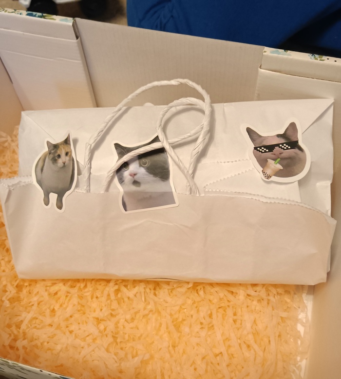 А самое главное, что все подарки были обклеены вот такими наклейками с котиками. Ну милота же! Рука не поднялась их выбросить, поэтому теперь наклейки живут на моём шкафу😆