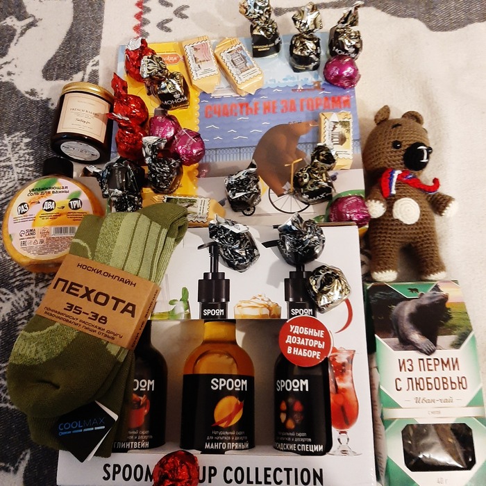Сиропчики к чаю и глинтвейну (который мы называем сибирским чаем😂), Пермский Иван-чай, конфеты 🍬 , а на коробке та самая знаменитая надпись "Счастье не за горами", соль для ванны, свеча с чудесным запахом, термоноски - очень нужная вещь - и самое главное...