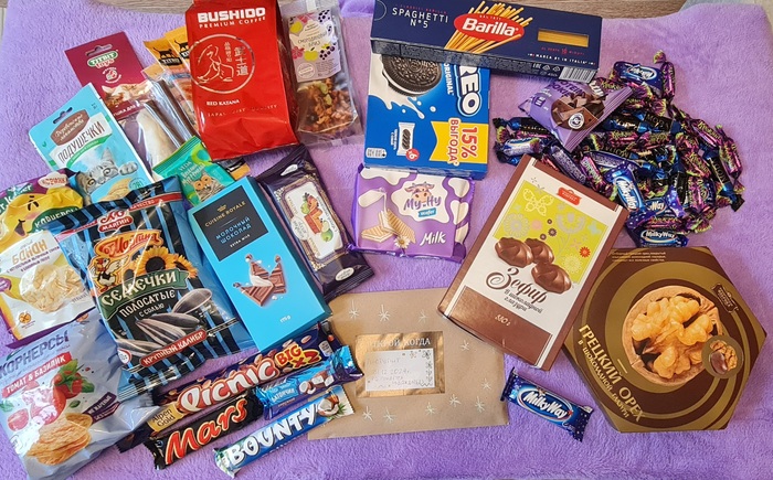 И общий вид всех вкусностей😅 Большое спасибо моей дорогой Снегурочке из Новосибирска за такую великолепную и вкусную посылочку! Посылаю тебе миллион лучей добра и тепла, а так же столько же хорошего настроения, сколько и ты мне подарила😄