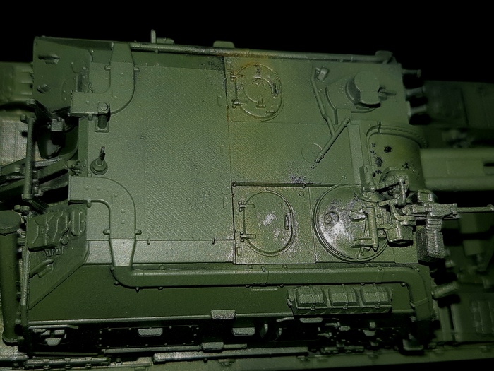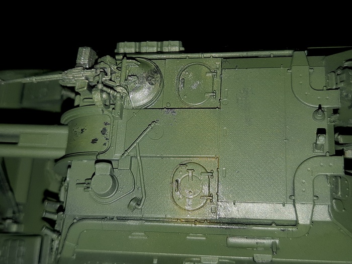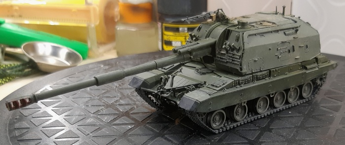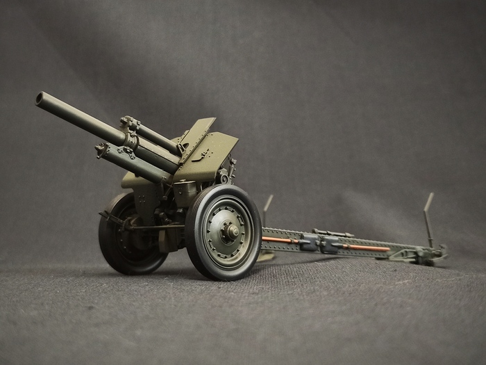 После покраски красками от «Звезды», покрывал лаком от Tamiya. На тот момент мой первый опыт работы с водорастворимыми красками, но эффект от сочетания несовместимой химии мне понравился. Краска немного скукожилась, появилась небольшая шагрень, что добавило гаубице шарма)