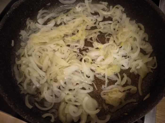Лук нарежьте тонкими полукольцами. Разогрейте сковороду, выложите лук и затем оливковое масло. Добавьте соль, черный перец, перемешайте. Жарьте на среднем огне 12 минут, до средней карамелизации (можно добавить масло и убавить огонь, если лук начнет подрумяниваться). Снимите с огня.