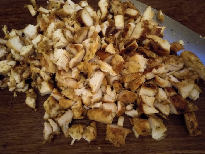 Куриные грудки сбрызните оливковым маслом. Посыпьте солью, черным перцем, порошком карри, прованскими травами. Запекайте при температуре 210C 15-20 минут (внутренняя температура 74C). Остудите, нарежьте кубиками. Как вариант, пожарьте на гриле или на сковороде.