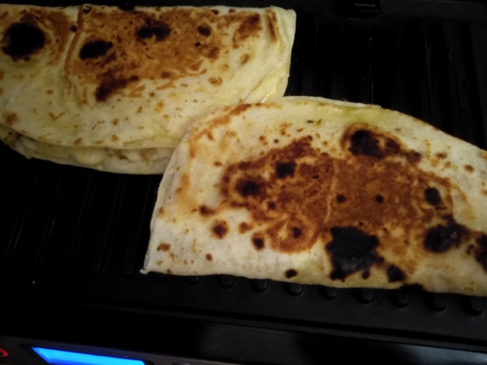 На пшеничную тортилью выложите половину сыра, нарезанную курицу, запеченную тыкву, жаренный лук, сверху оставшуюся половину сыра. Сверните в кесадилью.