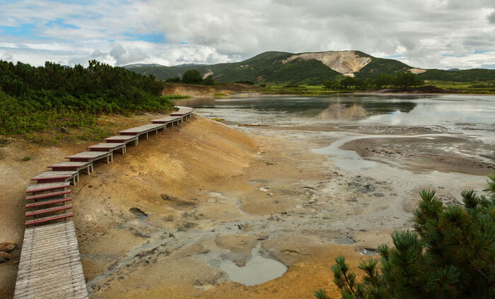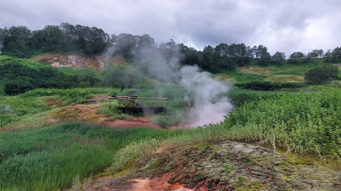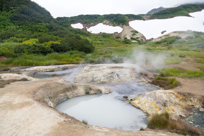 Горячие источники Малой долины гейзеров вблизи Мутновского вулкана образуют парогазовые струи с уникальным составом. В выбрасываемой воде содержатся медь, мышьяк, цинк и другие химические элементы. А группа источников Медвежья производит радон в особо высокой концентрации.