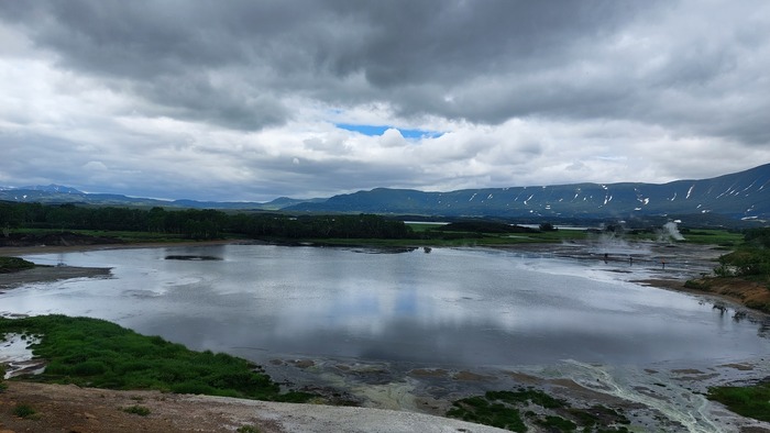 следующей остановкой была кальдера вулкана узон. кальдера - это, грубо говоря, котловина. там тоже различные горячие подземные источники, глина, фумаролы... честно, я ожидала чего-то большего от красивого названия кальдера) но в целом, там тоже было достаточно интересно. особенно понравились озерца голубого цвета, которые кажутся достаточно неглубокими. на самом деле там присутствует ложное дно, и глубина там ого-го.