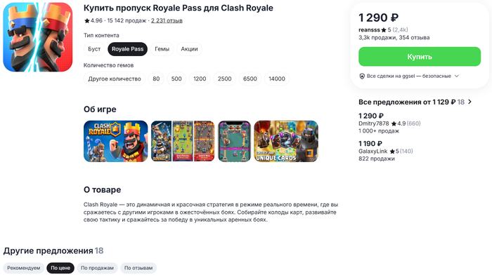 Если вам нужен Pass Royale без лишних хлопот — проще всего взять его на ggsel. Это крупный магазин цифровых товаров, где продаются не только Pass Royale, но и карты пополнения, внутриигровая валюта и другие полезные штуки для геймеров по приятным ценам. Никаких смен регионов и регистрации новых аккаунтов — все работает прямо и быстро.