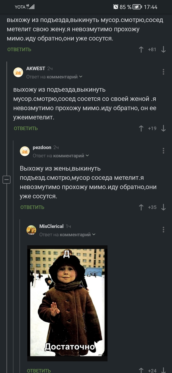 Стою, курю на работе, листаю ленту. И вдруг - мой комментарий в топе!! Ааааа!!! Радости мгновенно полные штаны! Весь день хвастался коллегам и друзьям) Это была моя минутка славы и единения с адекватными людьми - последнее особо дорого и приятно! Спасибо!
