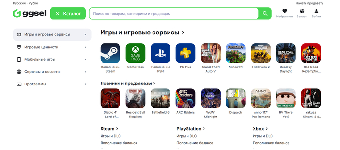 Переходите на ggsel.net — торговую площадку, где вы найдете игры для ПК и консолей, DLC, сможете пополнить баланс популярных игровых и неигровых сервисов, купить и продать игровой аккаунт. И все это — по низким ценам!