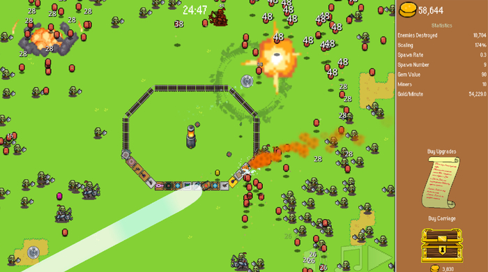 Садитесь в поезд и примите участие в главном вызове защиты поезда! Ваша задача — защитить Генератор Бесконечной Энергии, покупая вагоны для уничтожения врагов и генерации золота. Выбирайте с умом — только правильная комбинация вагонов позволит вам выжить в бесконечных волнах врагов. Улучшайте вагоны, объединяя 3 вагона одного типа и уровня, чтобы создать еще более мощные оборонительные конструкции! Вы можете улучшать вагоны бесконечно, но это будет стоить недешево.