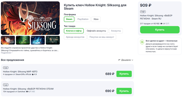 Переходим в категорию «Hollow Knight Silksong» и выбираем подходящий товар. Также, как и в предыдущем способе, смотрим на его критерии, внимательно читаем описание и оплачиваем.