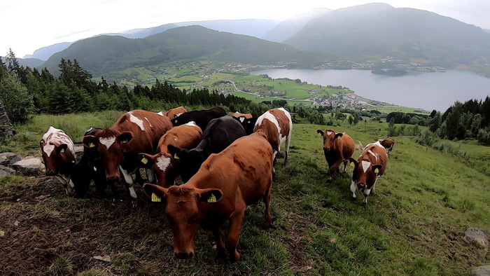 Пришлось немного сымпровизировать и уйти немного выше по склону. Короткое видео старта и пролета мимо коров: