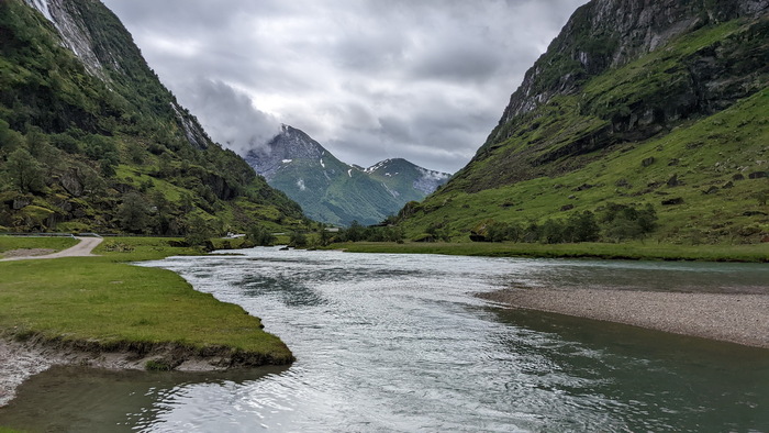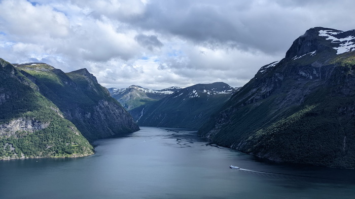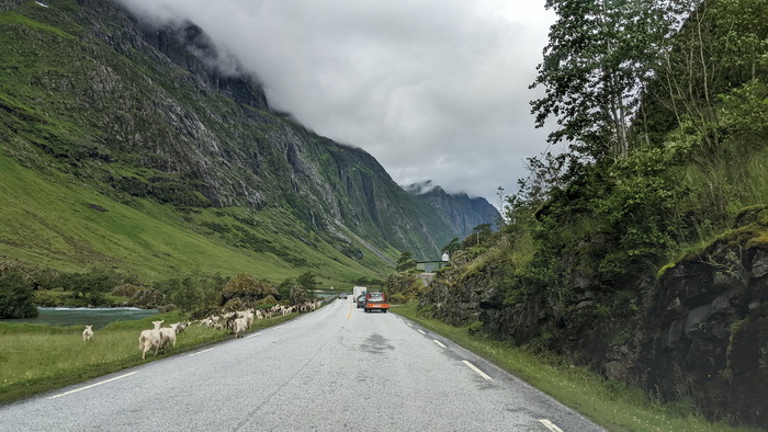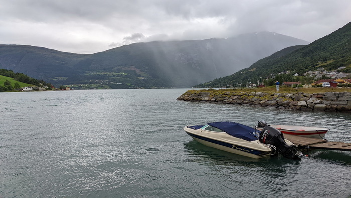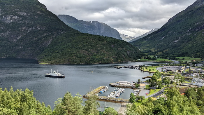 Выезжаю из Lærdalsøyri https://goo.gl/maps/9jQQKv9s99rsHSXd8 . Как это часто и бывает, надо перебраться на другой берег фьорда на пароме. В этом месте довольно большой трафик, поэтому паромов ходит два. На фото – встречный, такой же, на котором еду я.