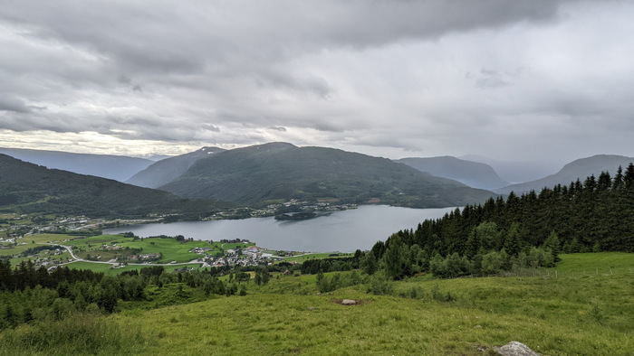 Доехал до Hafslo https://goo.gl/maps/EcT1pPeDajnVZ8FD6 , оставил машину внизу у зоны посадки и пошел наверх. Место https://www.dhv.de/db2/details.php?qi=glp_details&popup=1&item=4554 с небольшим перепадом высоты и без термиков. Вид с предполагаемого старта: