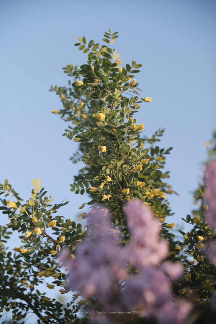 Гелиос 40-2 (1984) со спидбустером Viltrox EF-FX2. Сирень, акация и поле с одуванчиками