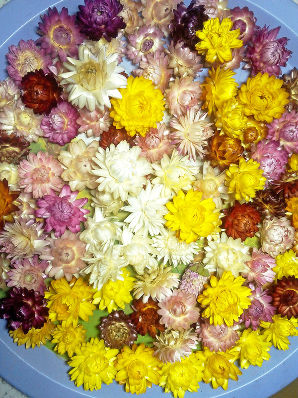 Этим летом удалось изготовить достаточно много сфер с одуванчиками, и захотелось разнообразия в виде чудесных разноцветных гелихризумов, или бессмертников. Погуглив, нашла, у кого их приобрести, и в моем распоряжении оказалась целая коллекция этих цветочков разных оттенков. А вот и первые изделия из них)