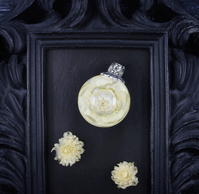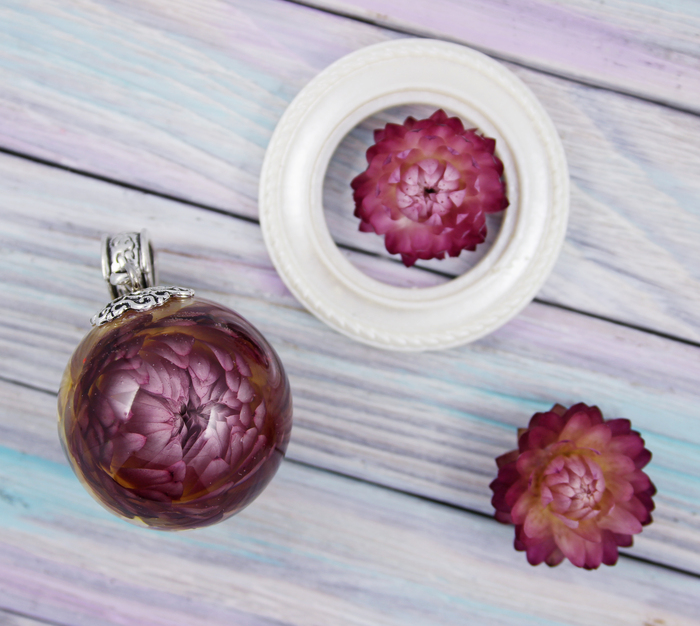 Процесс изготовления такой же, как и кулонов с одуванчиками, только можно не бояться, что цветы разлетятся при работе с ними) А так все то же самое - выбираю цветочек, подбираю подходящий по размеру силиконовый молд диаметром 25, 30 или 35 мм (я их заказываю и делаю разрезы, чтобы можно было их раскрыть), помещаю туда цветок и аккуратно заливаю прозрачной эпоксидной смолой.