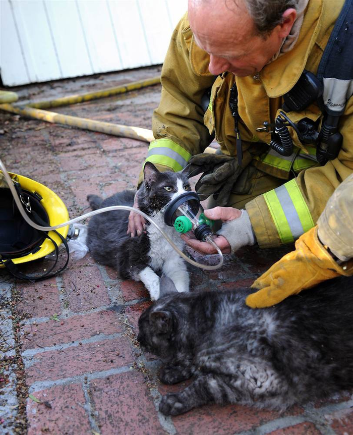 Коту дают подышать кислородом, дабы изгнать СО из его эритроцитов.