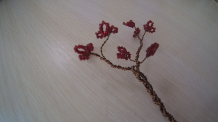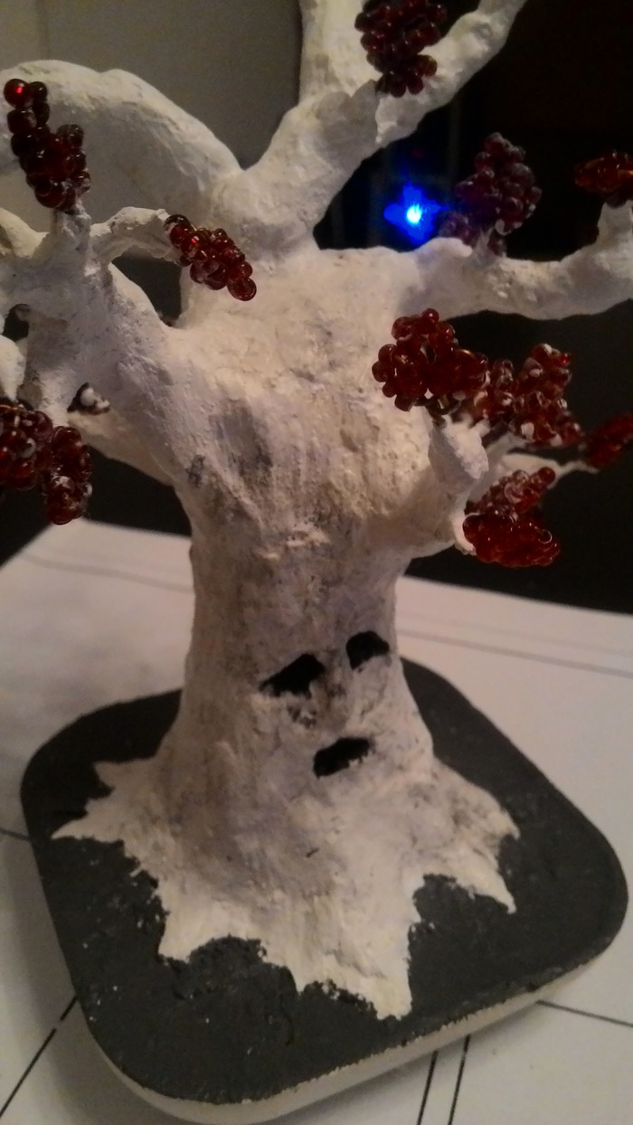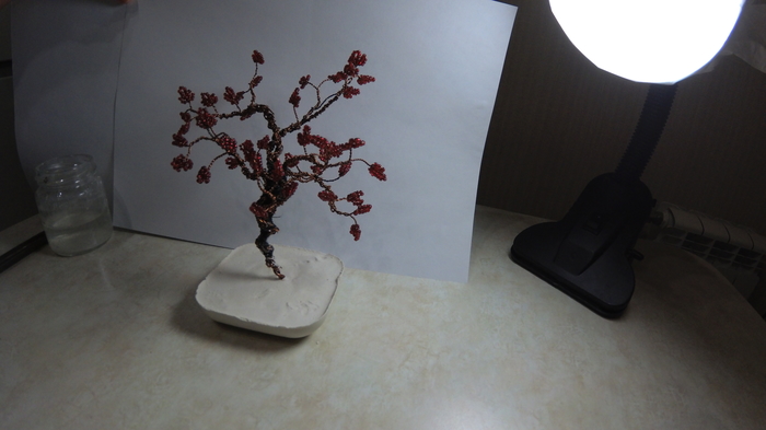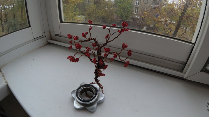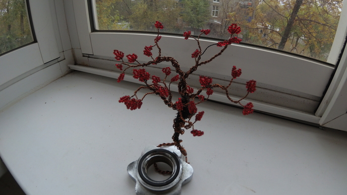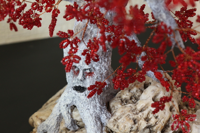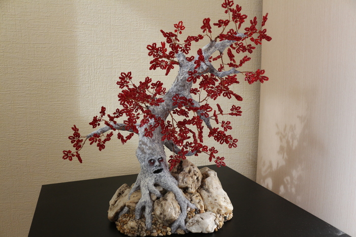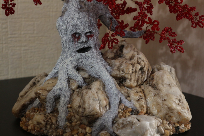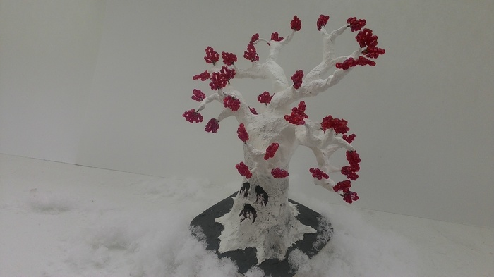 Наконец-то закончил свой долгострой. Подробно описывать процесс не буду, уже делал это в прошлом посте про бонсай из бисера. Специально не стал делать много "листвы"-попытался создать эффект умирающего дерева.