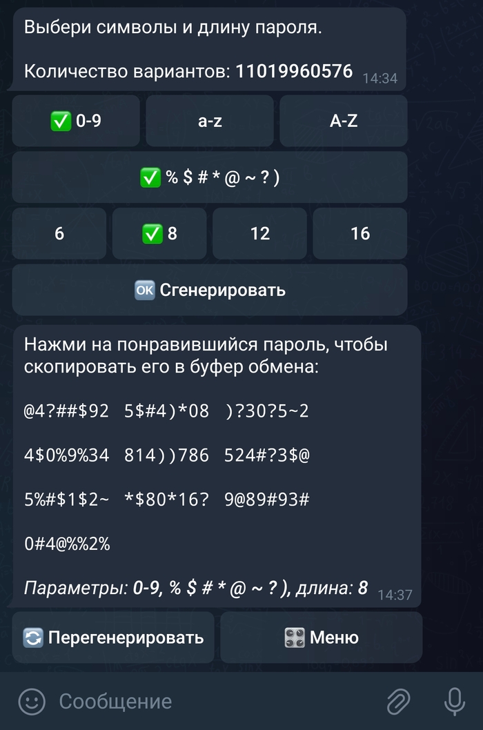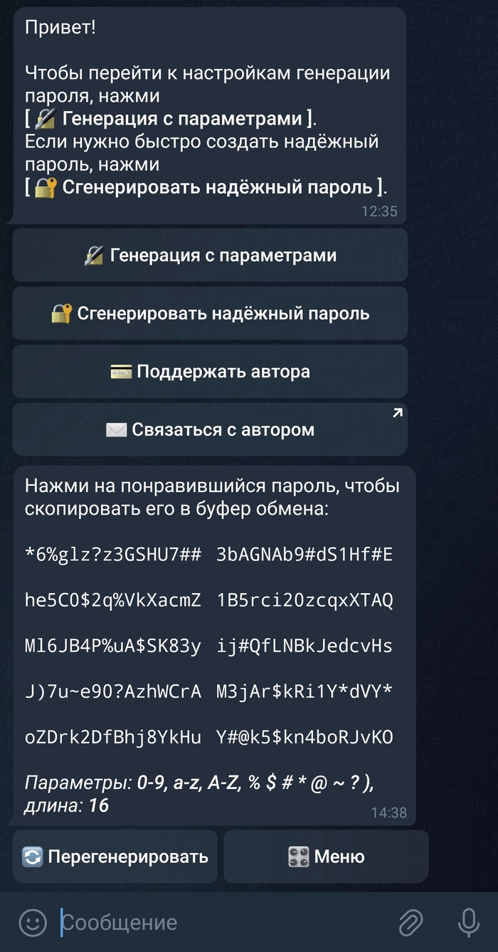 Бот отправит сообщение с 10 сгенерированными паролями по заданным параметрам. На всякий случай в сообщении продублировано, какие параметры выбраны. Кнопка "перегенерировать" сгенерирует новые пароли и перезапишет ими старые.