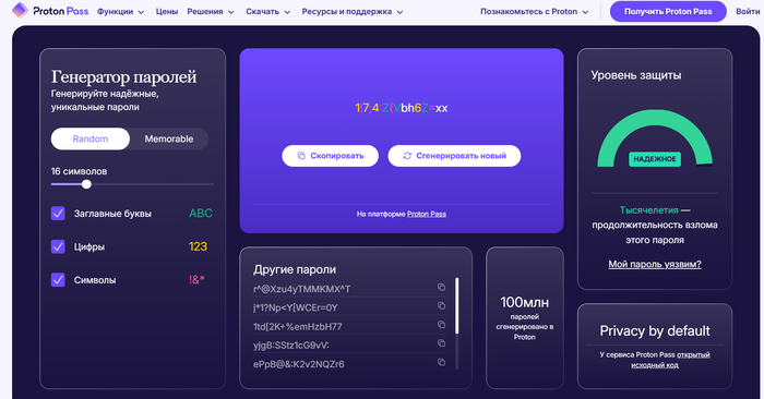 Вторая кнопка позволяет в один клик сгенерировать надёжный пароль. Он будет включать в себя все доступные символы и иметь длину в 16 символов. Всего таких паролей будет предложено также 10 штук, и их можно перегенерировать с помощью соответствующей кнопки.