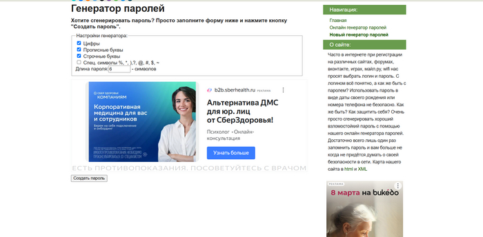 Отличный генератор паролей, который учтёт Ваши настройки и предложит сразу несколько вариантов паролей. Нажав по паролю, он сохранится в буфер обмена.
