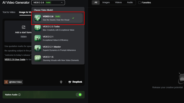 В разделе «Видео» или «AI‑Видео» выберите модель Kling AI Motion Control (2.6) — этот режим ориентирован на перенос движений из видео‑референса на изображение.