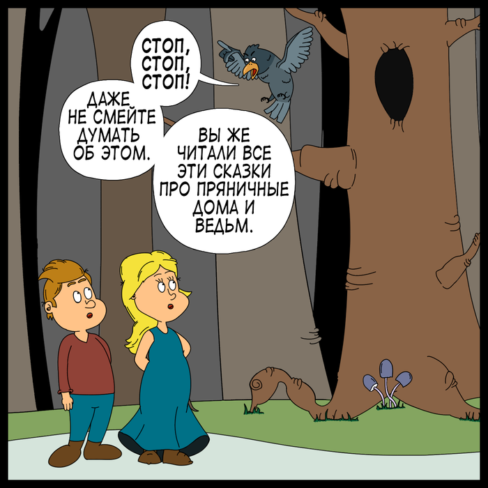 – Да! – воскликнул Гензель и подскочил. – Мы справимся и без этих кошмарных родителей! Так два смелых ребёнка, уже немного повзрослевших, ставших мудрее, с девятнадцатью пальцами на двоих, отправились на поиски своей собственной судьбы".
