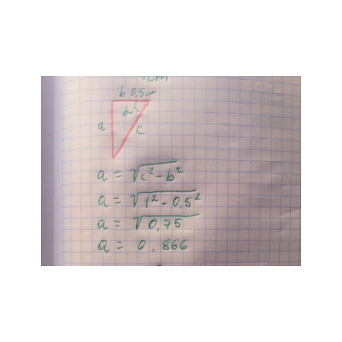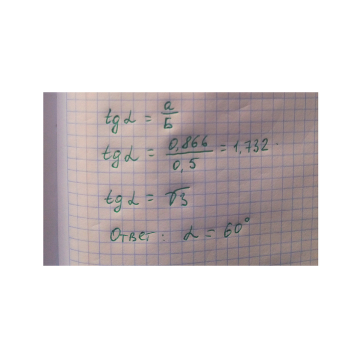 Потом пришлось перечитать все про косинусы, тангенсы, нашла супертабличку которой уже не помнила как пользоваться. И даже получилось выяснить что угол равен 60° (да простят меня математики за корявые вычисления)