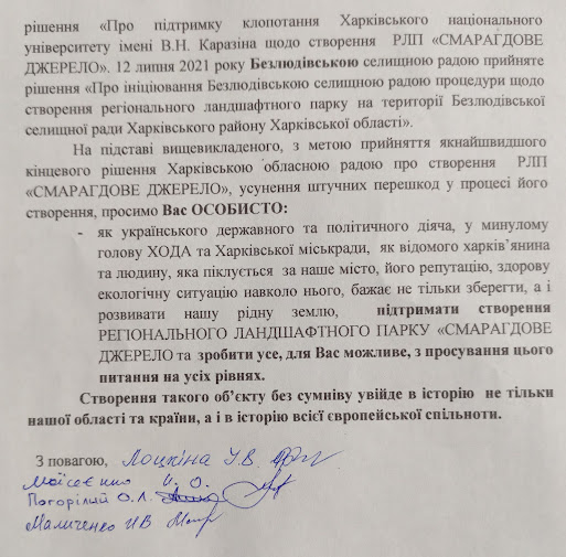 «Просим Вас ЛИЧНО: как украинского государственного и политического деятеля, голову ХОГА и Харьковского горсовета в прошлом, как известного харьковчанина и человека, который заботится о нашем городе, его репутации, здоровой экологической ситуации вокруг него, который желает не только сохранить, но и развивать нашу родную землю, поддержать создание регионального ландшафтного парка «ИЗУМРУДНЫЙ ИСТОЧНИК» и сделать все, для Вас возможное, по продвижению этого вопроса на всех уровнях», - сказано в обращении.