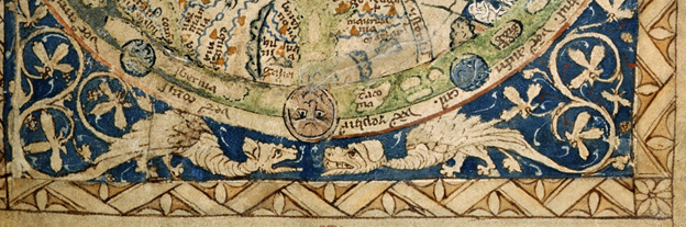 ◼️ Карта из псалтыри начала 1260-х годов. Драконы как символы греха находятся в нижней части изображения, уравновешивая Иисуса и ангелов сверху, однако за пределами собственно карты.