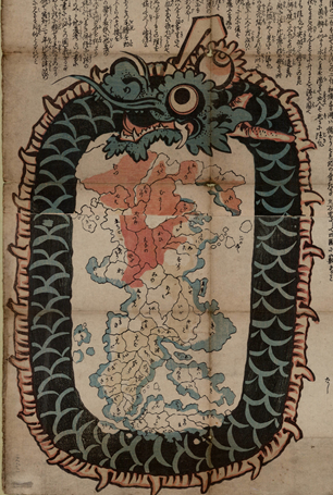 ◼️ На японской карте Дзисин-но-бен (XIX век) мир окружён уроборосом — кусающим свой хвост драконом, вызывающим землетрясения.