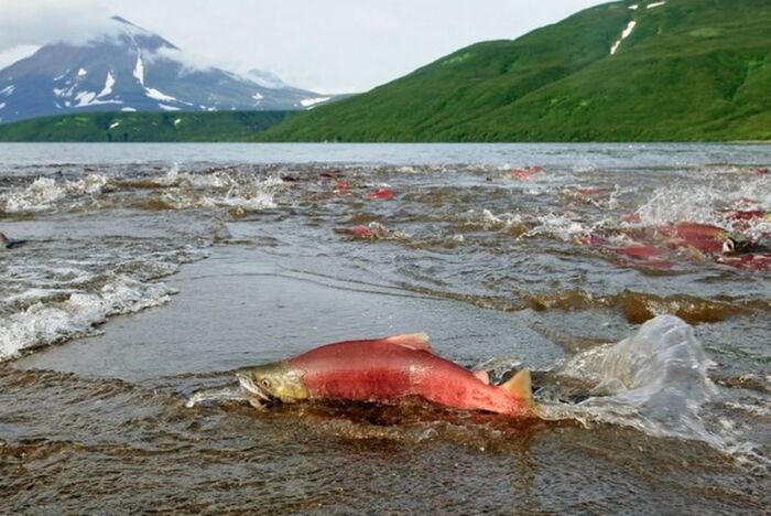 9. Реки Камчатки богаты лососем. Каждый год здесь проходит массовый нерест лососевых рыб.
