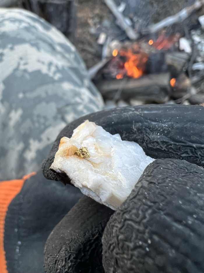 Подождали, кварц нагрелся, и Коллега уже без особых усилий стал долбить. Я взял обломок, который он посмотрел, и стал его крутить, чтобы на переливе света увидеть значок золота. И есть.