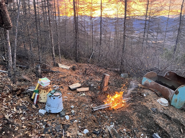 Коллега оглядел все это хозяйство, и начал ковыряться. Я начал хозяйничать – сделал костерок, из старых ведер сделал столик, разложился. Запарил доширак, тушенку. Коллега пока ничего не нашел, колотил обломки кварца молотком. Как только костер стал не нужным для хозяйственных целей, обломки кварца попросил Коллегу побросать в костер, чтобы проще было долбить его. Я особого энтузиазма не проявлял в поисках, так как никогда не занимался собирательством образцов.