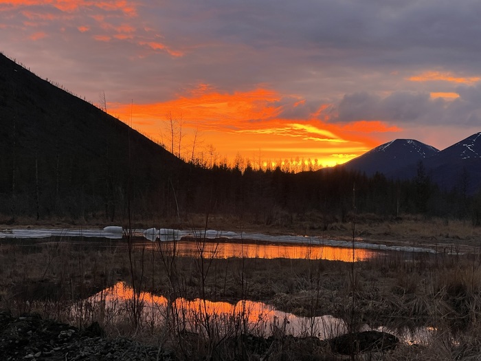 И мы двинулись в путь. Шли нормальным шагом по дороге, были сумерки. Не белые ночи, но и не зимний мрак, что-то такое промежуточное. Я заметил, что в тайге организм перестраивается, начинаешь слышать и обращать внимание на малейшие звуки. Вероятно, что-то первобытное просыпается в человеке в такие моменты. Я рассказывал Коллеге про эти места, рудопроявления, где мы маршрутили, бурили, проходили канавы. Дорога в неплохом состоянии для таких дорог, много следов от грузовых машин. «Наверное старатели работают» подумалось мне. До большого ручья дошли за 2 часа. И увиденное не очень понравилось. Вода большая.