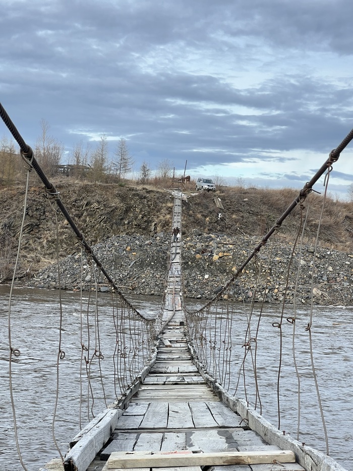 Подъехали поближе к мостику через реку Эльга, рядом стоит балок. Мостик, то еще произведение. Весь качается… это надо видеть и почувствовать) но привыкши, по нему чуть ли не бежишь. Раньше его артель поддерживала, восстановили топлипровод и перекачивали по нему топливо в летнее время, а сейчас он разваливается потихоньку. Летом, когда нет зимника, этот мостик единственное связующее звено «той стороны реки» с поселком Маршальский.
