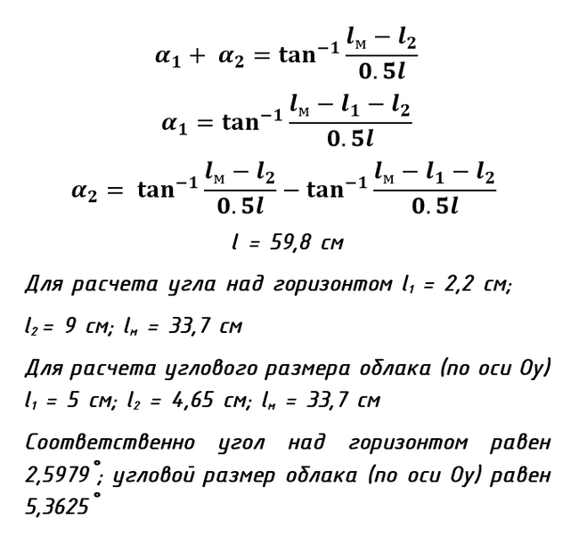 Начнем с углового размера облаков и углового расстояния от условного горизонта до основания облака
