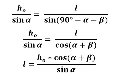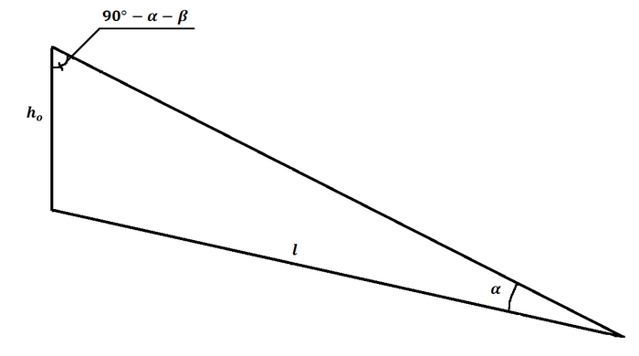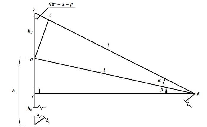В данной фигуре нам известны обозначенные буквами углы, а также длины h и hо. Найти нужно hи. Для этого мы сперва рассмотри треугольник BDE