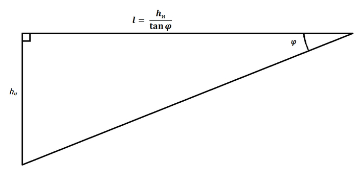 Теперь перейдем к расчету расстояния от ГГ до точек замера. Делать мы это будем довольно простым способом: высоту, которую мы нашли только что мы будем делить на тангенс углового расстояния от горизонта до точки замера. Чтоб было понятнее построим треугольник, где точки при острых углах - положения точки замера и Итэра