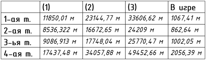 Делим расстояния в столбцах (1), (2) и (3) на расстояния в игре и получаем уже таблицу масштабов: