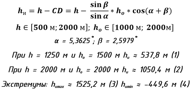 И теперь вернемся к нашему большому треугольнику. Можно заметить, что искомая величина не что иное, как разность h и CD. Поэтому мы можем вывести формулу этой самой hи. Почему формулу, а не число? Так будет проще, ибо мы не знаем точные значение h и hо, а знаем лишь на каких промежутках они лежат. Поэтому искомую величину проще выразить как функцию от двух переменных